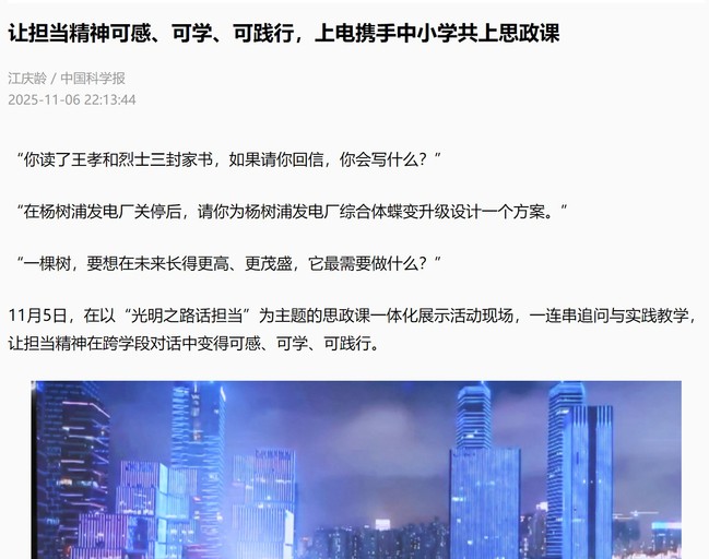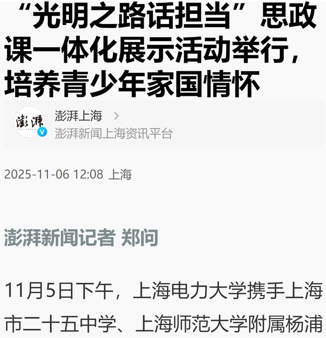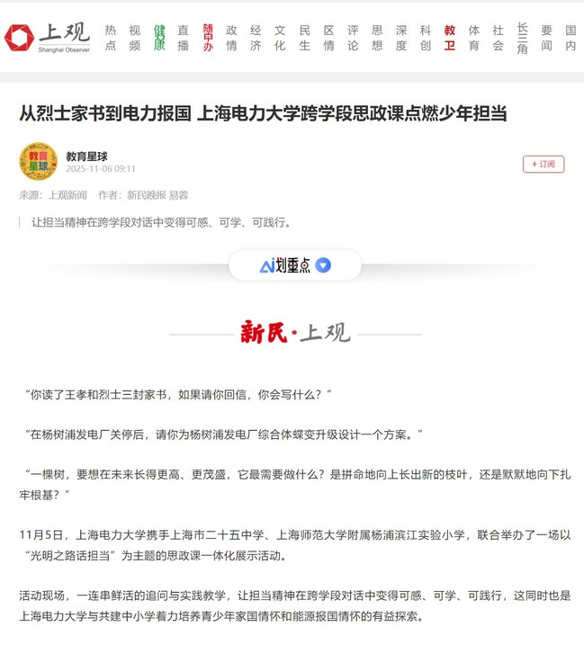 日前,我校携手上海市二十五中学、上海师范大学附属杨浦滨江实验小学,以“光明之路话担当”为主题,联合举办了一场大中小学思政课一体化教学展示活动。学校宣传部协同马克思主义学院积极挖掘新闻亮点,凝练工作特色,及时组稿向各大媒体推介。中国新闻网、中国科学报、上观新闻·新民晚报、澎湃新闻、上海科技报、第一教育等多家主流媒体纷纷予以报道,在社会层面展示了我校推进大中小思政课一体化的创新探索。