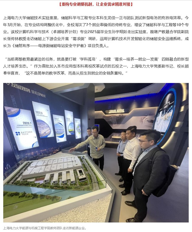 文章指出,上海电力大学根据前沿领域和产业发展需求加速推进专业布局调整与结构优化,推动培养体系从“学科逻辑”向“产业逻辑”转变、培养方式从“标准化培养”向“定制化培养”转变。介绍了我校构建“需求—培养—就业—发展”四链融合新型人才培养生态的举措和实效。
