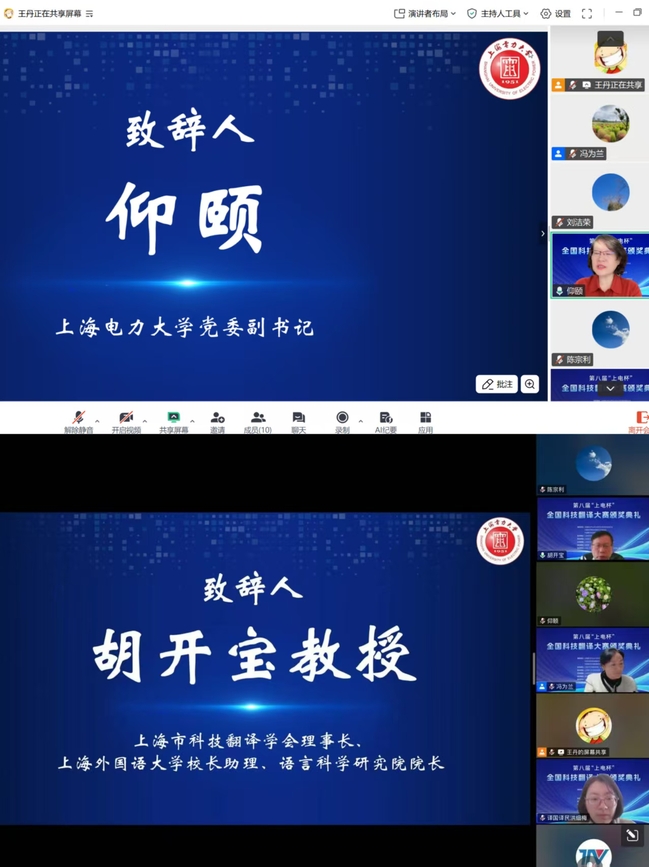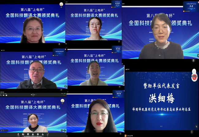 为加强我国科技翻译人才队伍建设与成果转化应用,助力科技翻译事业高质量发展,12月7日,由我校与上海市科学技术协会联合主办的第八届“上电杯”全国科技翻译大赛颁奖典礼以网络直播形式举行。我校党委副书记仰颐,上海市科技翻译学会理事长、上海外国语大学校长助理、语言科学研究院院长胡开宝教授,上海外国语大学语言科学院韩子满教授,北京外国语大学高级翻译学院王华树教授,复旦大学外文学院陶友兰教授,译国译民集团党支部书记兼高校事业部总监洪细梅女士,以及获奖选手、优秀指导教师及优秀组织单位代表齐聚云端,共襄盛会。典礼开幕式由我校文科学部党委书记刘洁荣主持。