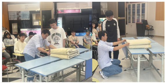 活动伊始,退伍学生代表杨斌向同学们讲述自己在部队时期的内务标准,并强调宿舍作为同学们学习和生活的重要场所需要每一位宿舍成员共同整理维护。紧接着对叠被子的详细步骤和基本要领进行细致讲解和展示,通过抖、量、压、切、塞、抹、整等一系列动作完美实现“棉被”到“豆腐块”转变,活动现场掌声热烈,同学们跃跃欲试动手实践。