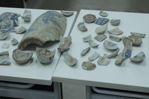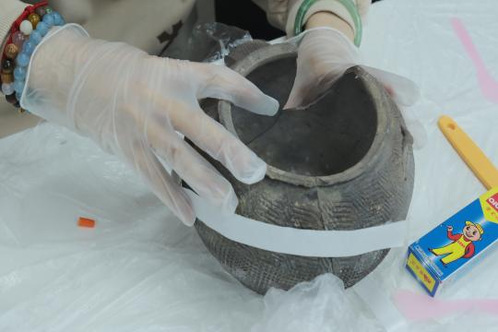 “修复瓷韵,对话往昔”陶瓷修复活动里,在场学生仿佛化身为时光的“修缮师”,在专业老师的讲解下,仔细观察手中陶瓷碎片的质地、颜色、纹饰,以及破损的程度。实操过程中,同学们先将瓷片放入水中洗净,去除污垢和杂质;随后用胶水将碎瓷片拼接完整,再用打样膏拓出瓷器缺失部分的形状并用石膏填补,待成型后,再用水砂纸细心打磨,使修复处与原瓷片自然融合。