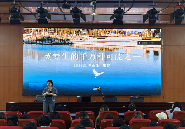 张伊以“英专生的千万种可能之一”为题,结合自身从外语教师成长为教育领域管理者的经历,为学弟学妹们剖析职业规划的关键点。她强调,职业选择需立足个人兴趣与市场需求双重视角,提前布局留学申请,夯实语言与专业能力。针对考研与留学规划,张伊通过案例对比指出,留学申请需注重“院校匹配度与文书个性化”,而考研备战应“聚焦目标院校真题,强化专业深度”。