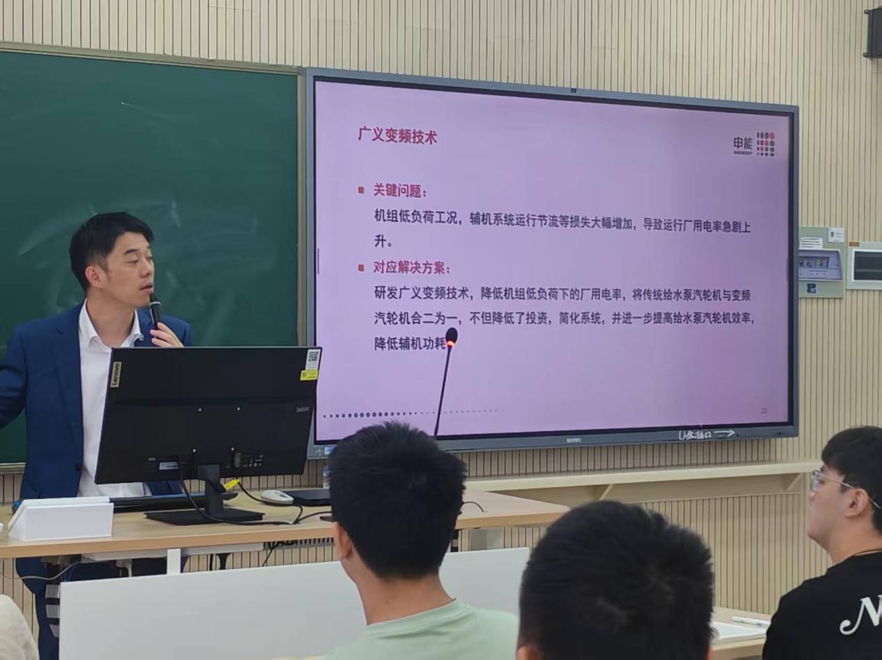 课堂上,杨文虎结合多年行业实践经验,在系统阐述高效低碳火力发电技术发展趋势的基础上,重点围绕“单元机组集控运行”课程的核心知识点,以申能集团的经典项目为教学样本展开讲解。其中,上海外高桥第三发电厂项目和华润曹妃甸项目为课程提供了技术演进参考,而国家示范工程——申能安徽平山电厂二期工程,则成为“单元机组集控运行”课程的“活教材”。