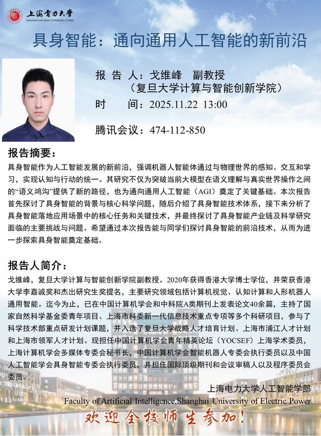 主讲人简介:戈维峰,复旦大学计算与智能创新学院副教授。2020年获得香港大学博士学位,并荣获香港大学李嘉诚奖和杰出研究生奖提名,主要研究领域包括计算机视觉、认知计算和人形机器人通用智能。迄今为止,已在中国计算机学会和中科院A类期刊上发表论文40余篇,主持了国家自然科学基金委青年项目、上海市科委新一代信息技术重点专项等多个科研项目,参与了科学技术部重点研发计划课题,并入选了复旦大学战略人才培育计划、上海市浦江人才计划和上海市领军人才计划。现担任中国计算机学会青年精英论坛(YOCSEF)上海学术委员,上海计算机学会多媒体专委会秘书长,中国计算机学会智能机器人专委会执行委员以及中国人工智能学会具身智能专委会执行委员,并担任国际顶级期刊和会议审稿人以及程序委员会委员。