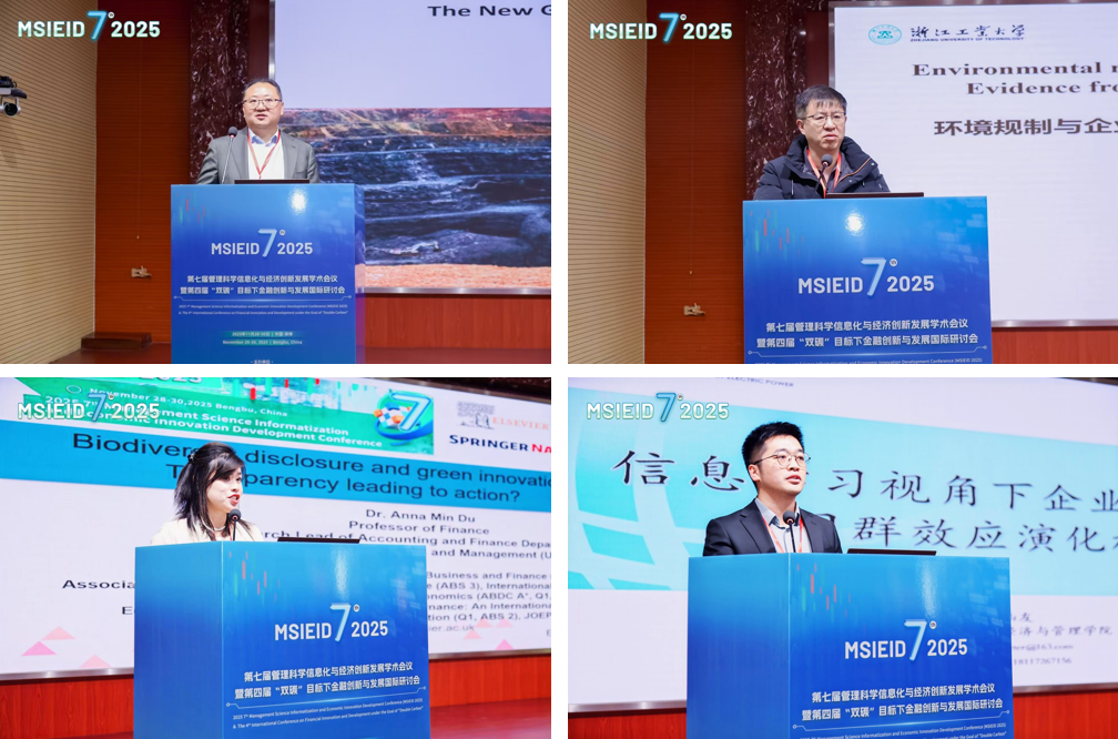 在主旨报告环节,澳大利亚麦考瑞大学史杨焱教授、浙江工业大学杜群阳教授、英国爱丁堡龙比亚大学杜敏教授、我校经济与管理学院潘仙友老师带来了精彩纷呈的主旨报告。潘仙友作题为《信息学习视角下企业绿色投资同群效应演化机制》的主旨报告,他从行为金融与信息经济学的交叉视角出发,构建了新颖的理论分析框架,深入阐释了企业在绿色投资决策中如何受同行行为影响,以及这种“同群效应”随信息学习过程动态演化的内在机制。该研究为理解和引导“双碳”目标下企业群体的绿色转型行为提供了重要的理论支撑与政策启示,其创新的研究视角与严谨的论证赢得了在场学者的高度评价和热烈讨论。