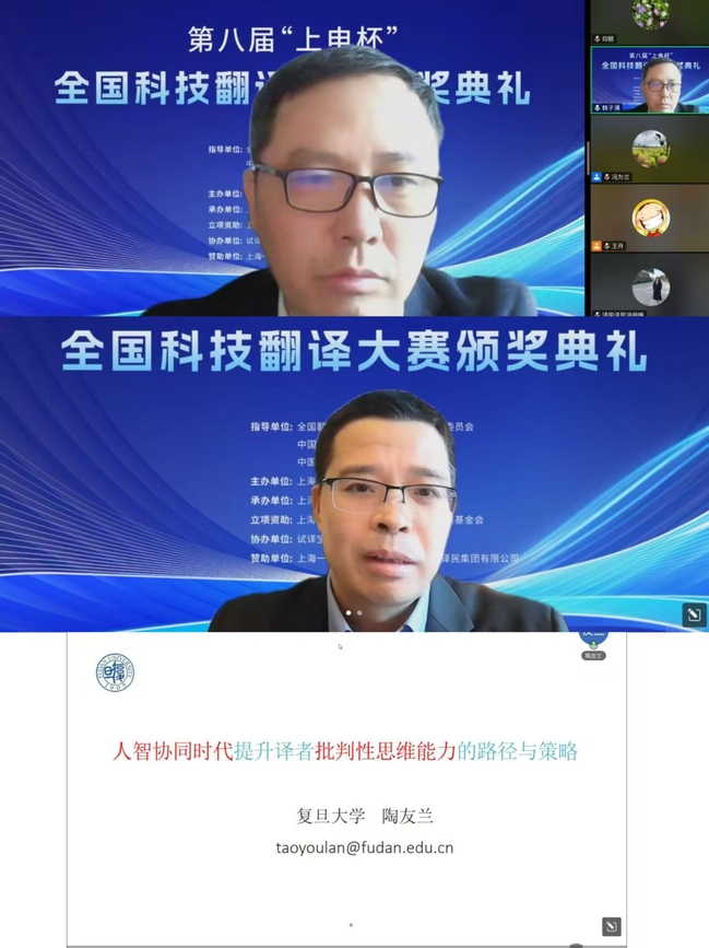 为加强我国科技翻译人才队伍建设与成果转化应用,助力科技翻译事业高质量发展,12月7日,由我校与上海市科学技术协会联合主办的第八届“上电杯”全国科技翻译大赛颁奖典礼以网络直播形式举行。我校党委副书记仰颐,上海市科技翻译学会理事长、上海外国语大学校长助理、语言科学研究院院长胡开宝教授,上海外国语大学语言科学院韩子满教授,北京外国语大学高级翻译学院王华树教授,复旦大学外文学院陶友兰教授,译国译民集团党支部书记兼高校事业部总监洪细梅女士,以及获奖选手、优秀指导教师及优秀组织单位代表齐聚云端,共襄盛会。典礼开幕式由我校文科学部党委书记刘洁荣主持。