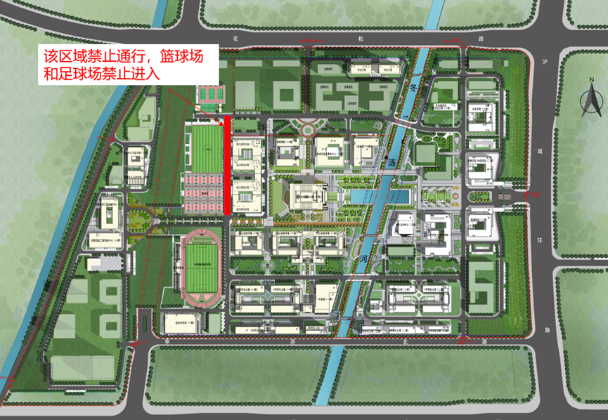封闭期间,篮球场和北足球场东侧的西环路禁止通行,切勿擅自进入施工区域,避免发生安全事故。
