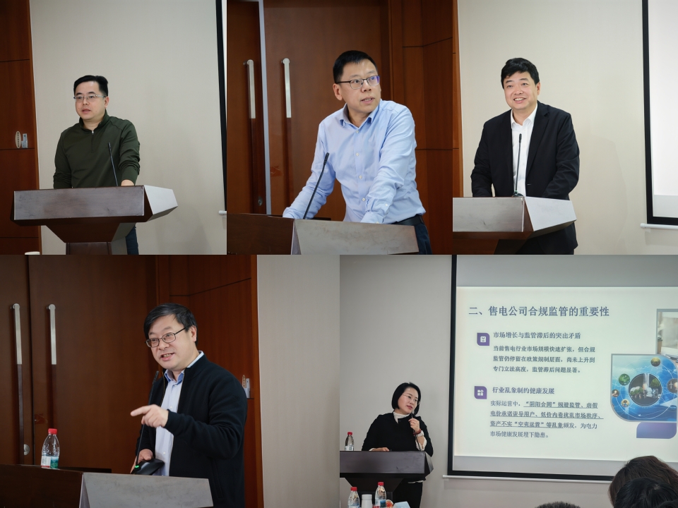 在主旨演讲环节,多位行业专家和高校学者围绕电力市场合规管理与风险防控进行交流分享。上海市电力交易中心董事长、党委书记杨菁结合上海电力市场“三防双控”风险防控体系实践,阐释了该体系在规范交易行为、防范市场风险等方面的关键作用。北京电力交易中心市场交易三部副主任葛朝强梳理了长三角电力市场建设及合规规则体系,结合典型违规案例,强调了市场主体严守合规红线的重要性。华电上海公司市场营销部主任肖明卫结合企业实践,分享了售电公司在合规经营、业务转型及服务模式升级方面的探索经验,并呼吁售电企业从“电价中间商”向综合能源服务商转变。我校专家学者从理论与实践结合的角度进行了专题交流。谢敬东教授聚焦电力市场合规管理核心矛盾,指出市场主体逐利违规行为与监管机制短板的“矛”“盾”关系,分析了电力市场合规管理中的关键问题及主要风险挑战;司军艳副教授则结合新型电力市场发展趋势,解读售电公司监管核心政策,分享多地监管创新实践,并就立法完善和规则统一提出思路。