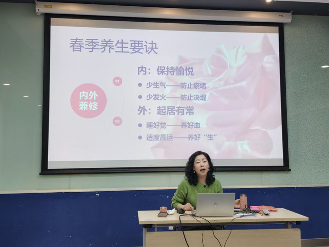 讲座在温馨的节日祝福中拉开帷幕。何老师持有中医师资格证,深耕中医养生多年。讲座伊始,她从《黄帝内经·素问·上古天真论》中的养生智慧切入,围绕“养生根本大法”展开分享。她指出,养生需内外兼修:对内要“调畅情志”,做到“恬淡虚无,真气从之”,保持精神内守、情绪平和;对外要“顺时而为”,顺应时令变化调整作息与饮食,正如“虚邪贼风,避之有时”所言,懂得规避外邪、养护正气。何老师结合春季气候特点,深入浅出地讲解了情志与健康的关系、时令对身体的影响,帮助老师们在日常生活中更好地关照自身。