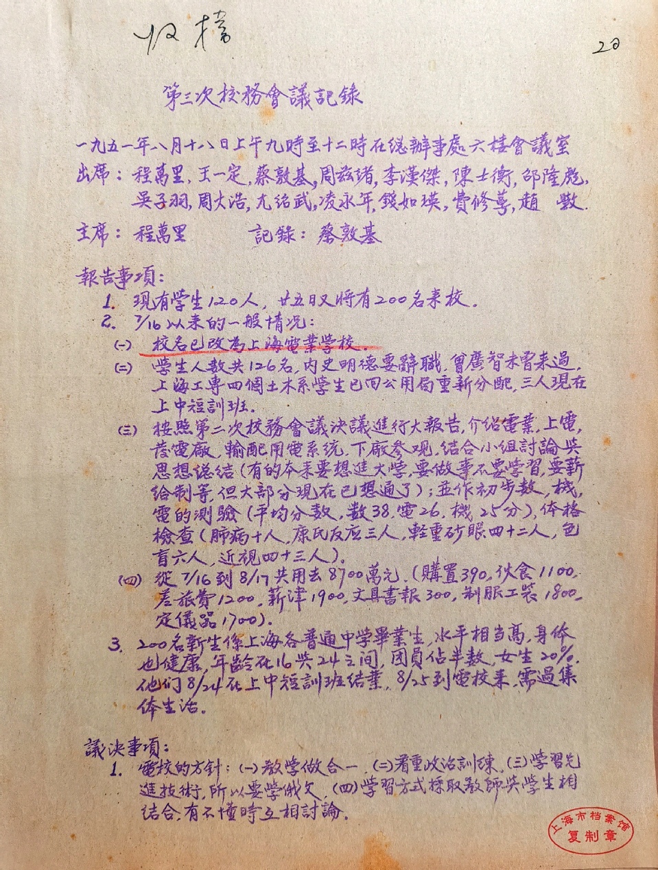 短短三日后,即7月9日,上海电力公司召开上海电业学校第一次筹备会议,成立校务委员会(见图2),由程万里、王一定、蔡敦基、陈士衡、李汉杰、周兹绪、邵隆彪七位同志组成,程万里担任主任委员。会议明确学校培养目标为:三年内,通过理论与实践相结合、技术与政治相结合的教育模式,让高中毕业生掌握火力发电厂相关技术理论知识,具备相当于大学毕业的理论水平,在实际技能方面能够胜任火力发电厂相关部门的技术管理工作。 8月18日,“上海电业学校”校名正式确立(见图3)。