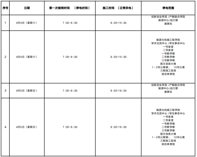 届时相关区域将短时停电,请各学院、各单位务必在停电时段做好各项准备工作。具体停电时间及涉及区域如下: