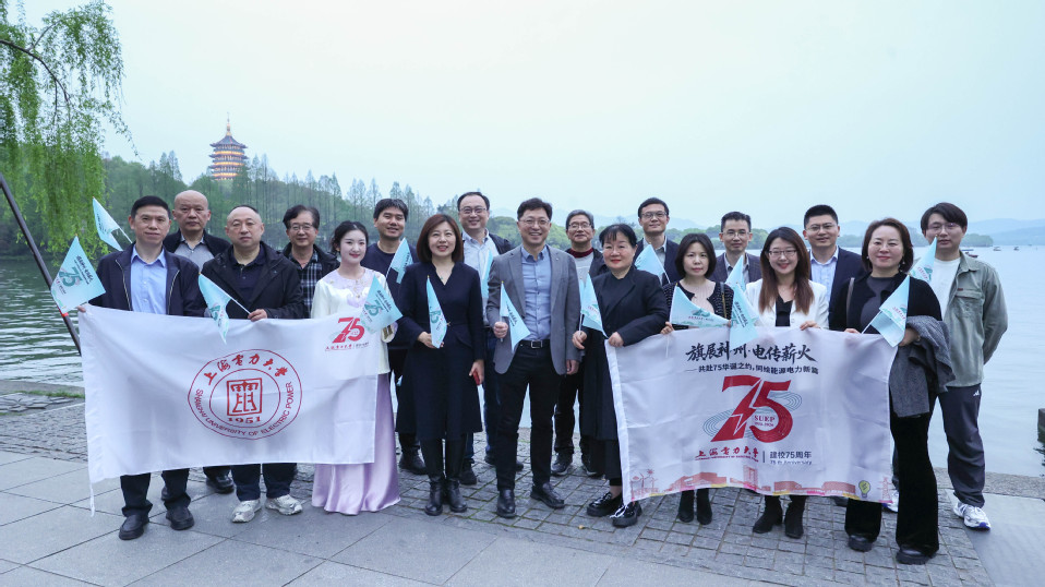 会议最后举行传旗仪式。校友代表与学校老师们携手并肩,共同完成传旗展示环节,齐声喊出“澎湃动能筑华章,旗展神州耀光芒”的响亮口号,铿锵有力的话语饱含着对母校的无限热爱与美好期许,大家真诚祝福上海电力大学75周年生日快乐,愿母校薪火相传、弦歌不辍,在能源电力高等教育领域续写新的辉煌!