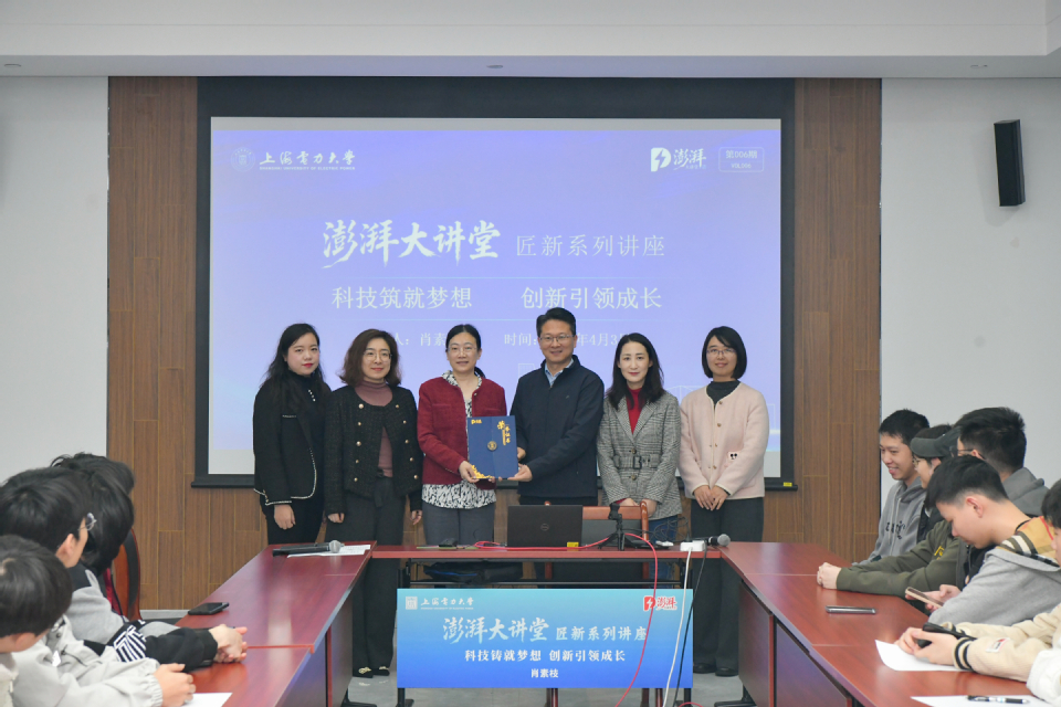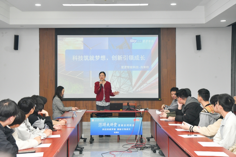 2026年4月3日下午,上海电力大学建校75周年高质量发展系列活动之“澎湃大讲堂”匠新系列讲座第六期成功举办。全国劳动模范、全国五一劳动奖章、上海工匠、上海市巾帼建功标兵、星逻人工智能技术(上海)有限公司联合创始人、蓝星研究院院长肖素枝应邀做题为《科技筑就梦想,创新引领成长》的主题讲座,校党委副书记、副校长朱克勇出席,并向肖素枝颁发“澎湃大讲堂”感谢状。校工会常务副主席、妇工委主任胡花玉、人工智能学部党委副书记齐永晓共同出席活动,人工智能学部师生到场学习。活动由胡花玉主持。