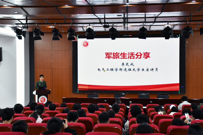 叶华刚作动员讲话,他指出电气工程学部高度重视征兵工作,通过辅导员老师、退伍大学生宣讲员将征兵政策讲深讲透。参军报国无上光荣,新时代国防和军队现代化建设亟需电气专业工科人才,希望有志入伍参军的电气大学生吃透政策早做打算,将个人理想融入国防事业,结合自身学业规划积极报名,以实际行动践行青年使命。