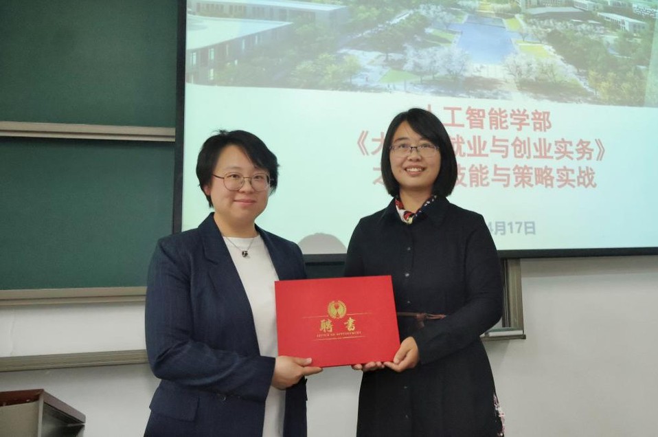齐永晓感谢三零卫士的大力支持,并向同学们强调了职业生涯规划对大学的重要意义,鼓励同学们积极拥抱技术变革,找准自身定位,提前做好职业规划,为未来的求职就业打下坚实基础。同时,她为三零卫士刘轶主任颁发人工智能学部职业成长导师聘书。