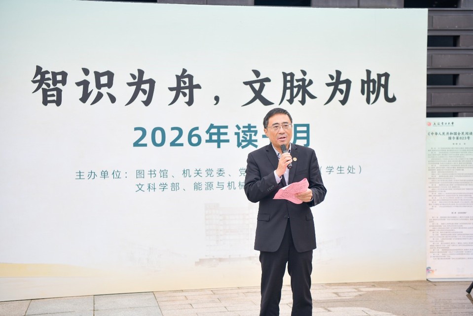 副校长符杨在致辞中指出,《条例》的颁布,为高校推进文化润校、建设书香校园提供了坚实的制度保障。他强调,在人工智能深刻改变知识生产方式的当下,“智识为舟”意味着师生要善用AI、大数据等智能工具,将其作为求知路上的“加速器”;而“文脉为帆”则警醒大家不忘人文之本,通过深耕经典典籍,为技术之舟校准航向,确保在信息洪流中不迷失方向。他勉励广大师生,既要拥抱新技术提升信息素养,更要回归经典涵养品格。符杨肯定了图书馆在资源保障与文化建设两大维度上的重要作用,并希望老师们做文化传承的引路人,同学们做主动的阅读者、智慧的探索者,将阅读从校园延伸至日常,从个人习惯升华为文化自觉。