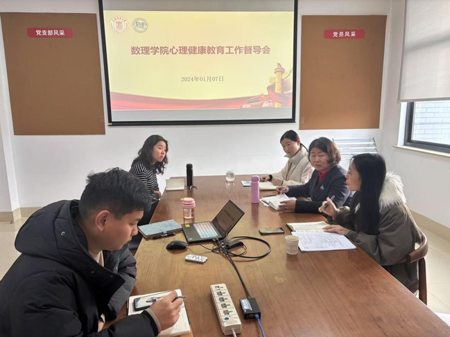 为进一步加强学生心理健康教育工作,提升辅导员心理健康教育水平和应对学生心理问题的专业能力,2025年1月7日,数理学院心理健康教育工作督导会在数理楼A302会议室召开。大学生心理健康教育中心李慧进行督导,学院党委副书记赵月琴及辅导员参加。