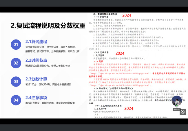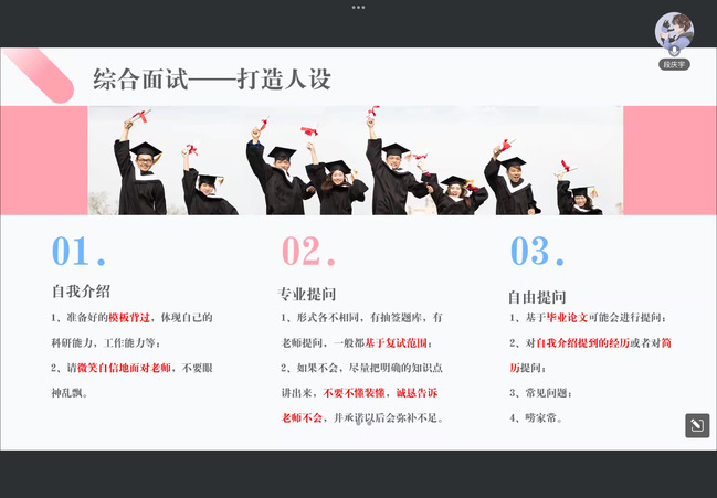 针对面试准备,学长们强调“细节致胜”:简历需突出科研实践、技能证书等硬核亮点,避免冗余信息;着装建议选择商务休闲风格,展现专业形象。在实战技巧方面,学长对自我介绍、专业提问、自由问答等环节逐一拆解,特别建议“遇难题可从关联领域切入分析,避免冷场”,并建议考生提前模拟面试场景。分享者们提醒到“复试成绩通常占总成绩30%-50%,直接影响录取结果及奖学金评定。最后,分享会还针对调剂策略、导师沟通技巧等延伸话题提供实用建议,助力考生从容应对复试挑战。