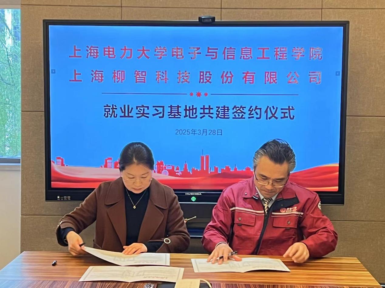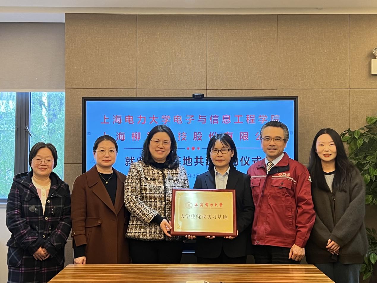 何西培为柳智科技授“大学生实习就业基地”牌匾,周冬梅与王伟作为双方代表签订上海电力大学就业实习基地协议书。