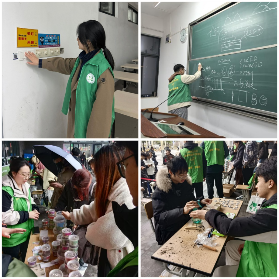 突出内涵特色,筑牢劳动教育“主阵地”。学院结合自身实际与校园文化建设需求,积极开展校园劳动实践活动,大力培育学生劳动文化。学院“砹水硒电”志愿服务队活跃在校园的各个角落,认真擦净黑板、关紧门窗、关闭电灯、检查水龙头,进行层层排查,及时上报问题并联系维修。通过这些行动,推动节水节电检查活动向可持续化、常态化迈进,引导师生从身边小事做起,为“双碳”目标贡献力量。雷锋月与植树节相遇,绿色行动如火如荼。植树节当天,学院在一食堂小广场举办节水节电和“双碳”知识科普宣传活动,提供绿植和特色花盆,邀请同学们参与种植体验。在志愿者的指导下,同学们亲手栽种并领养专属绿植,掌握养护知识,提升环保素养,为校园增添绿色生机,共建减碳校社。此次活动不仅丰富校园文化生活,更通过劳动实践培育学生的劳动文化,让绿色发展理念落地生根。
