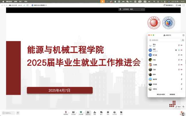 姜妍丽通报2025届硕士毕业生就业情况,对考博、考公及部分就业困难学生情况进行介绍;赵贵青、林枫、胡涬依次对新能源、机械、机电、能动、核工专业的2025届本科毕业生现阶段就业工作开展情况和各类学生就业工作推进情况进行汇报,同时梳理就业困难学生名单并依次进行介绍,分析每位困难学生情况和下一阶段重点工作。