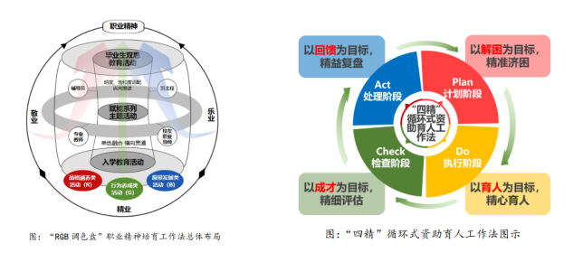《“RGB 调色盘”职业精神培育工作法》运用“RGB调色盘”原理,以“敬业、精业、乐业”精神为引领,以培养具有大视野、大格局、大担当的职业人才为目标,将职业精神融入人才培养全方位、全过程,致力于提升学生的精神素养和职业人格品质。《“四精循环式”资助育人工作法》将“PDCA”理念引入资助育人工作,以“解困-育人-成才-回馈”的良性循环为目标,打造“精准济困-精心育人-精细评估-精益复盘”的“四精”循环式资助育人工作方法,构建物质帮助、道德浸润、能力拓展、精神激励的发展型资助育人长效机制,引导受助学生实现全面发展,积极投身祖国最需要的地方,用劳动和创造回报学校及社会。