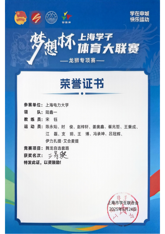 5月24日,由共青团上海市委员会、上海市教育委员会、上海市体育局指导,上海市学生联合会主办,上海杉达学院承办的“梦想杯”上海学子体育大联赛龙狮专项赛暨首届上海市高校龙狮精英赛在上海杉达学院金海路校区举行。来自沪上高校的23支龙狮代表队参加。我校计算机科学与技术学院学生组成的舞龙队代表我校参赛。