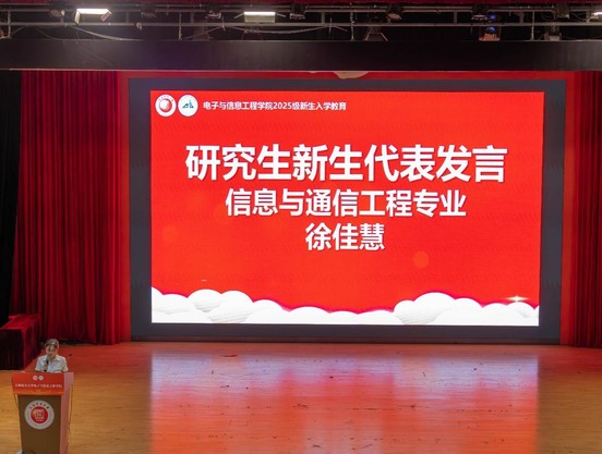 2025级信息与通信工程专业硕士生徐佳慧同学作为研究生新生代表发言。她分享了自己从本科毕业、踏入职场再到重返校园的独特心路历程,并坦言工作经历让她深刻认识到“知识应为需求服务”。站在新的人生起点,她围绕“厚植家国情怀,成长为堪当大任的拔尖创新人才”这一主题,号召全体新生要将个人研究方向与国家战略需求紧密结合,在潜心科研、勇于创新的过程中,践行校训精神,为上电发展谱写新的辉煌篇章。