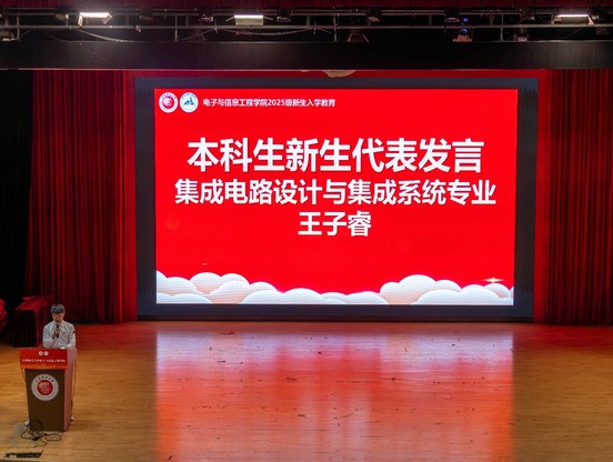 2025级集成电路设计与集成系统专业本科生王子睿作为本科新生代表发言。面对未来的学业挑战,他号召同学们保持军训中锤炼的毅力与专注,深耕专业、锤炼能力,并表示将快速适应大学生活,恪守院训,努力成为“懂技术、能实践”的电子信息人才,并将个人理想融入国家在电子信息领域的发展需要,勇担时代使命,贡献青春力量。
