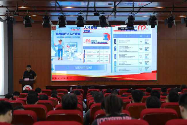 王亚霖介绍了临港新片区人才政策,围绕临港新片区人才补贴政策、大学生实习补贴及“360”全周期创客支持政策服务体系展开讲解,鼓励同学们到临港新片区企业就业或实习,积累实践经验,提升自身能力。