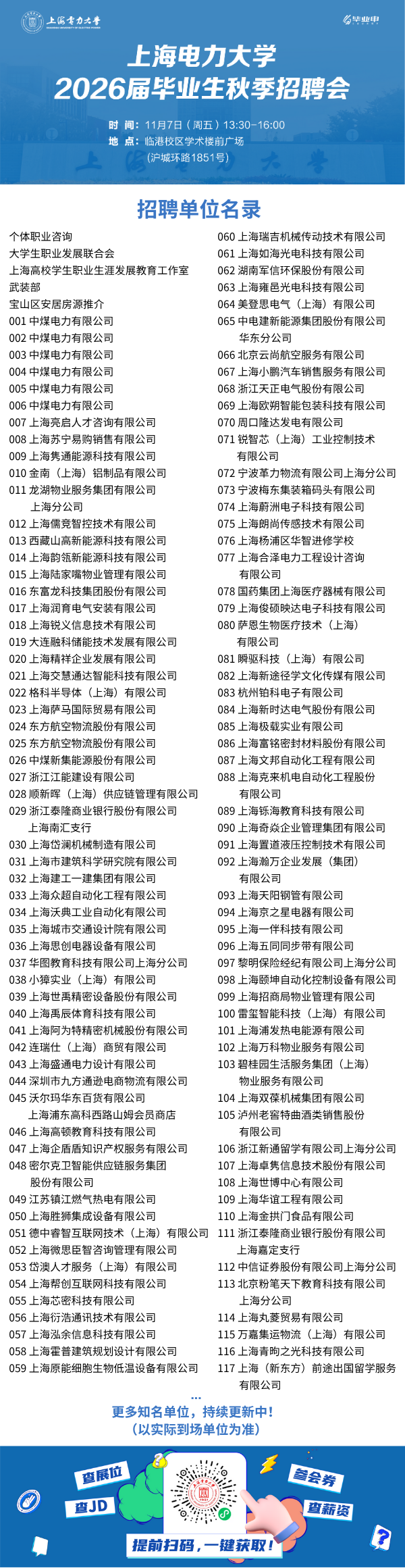 学校将通过本科生就业信息网和“上海电力大学就业指导中心”微信公众号持续发布用人单位招聘信息,请同学们关注。