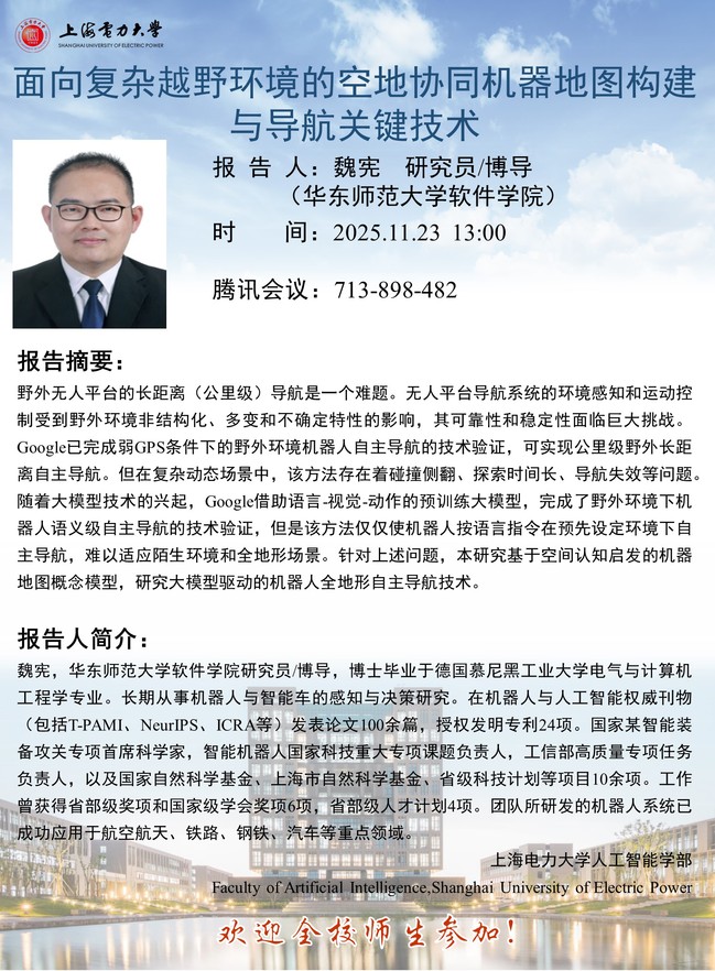 主讲人简介:魏宪,华东师范大学软件学院研究员/博导,博士毕业于德国慕尼黑工业大学电气与计算机工程学专业。长期从事机器人与智能车的感知与决策研究。在机器人与人工智能权威刊物(包括T-PAMI、NeurIPS、ICRA等)发表论文100余篇,授权发明专利24项。国家某智能装备攻关专项首席科学家,智能机器人国家科技重大专项课题负责人,工信部高质量专项任务负责人,以及国家自然科学基金、上海市自然科学基金、省级科技计划等项目10余项。工作曾获得省部级奖项和国家级学会奖项6项,省部级人才计划4项。团队所研发的机器人系统已成功应用于航空航天、铁路、钢铁、汽车等重点领域。