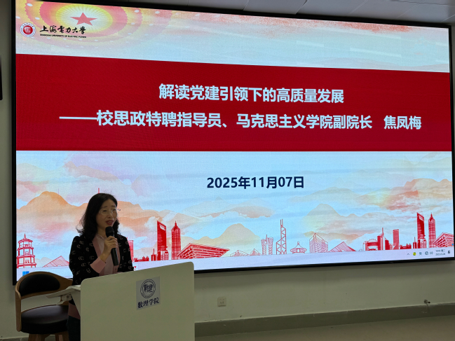 马克思主义学院副院长焦凤梅围绕“党建引领下的高质量发展”作专题指导。她从理论高度和实践层面,深入分析了党建工作与业务工作深度融合的路径与方法,强调要以高质量党建引领学院各项事业实现新突破、谱写新篇章。