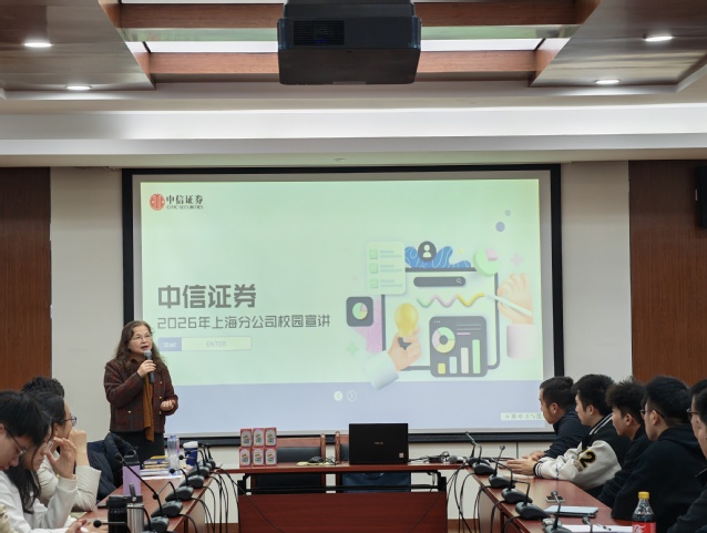 交流会后,中信证券上海分公司面向全校同学举办2026年校园招聘专场宣讲会。校总会计师张川,经管学院党委书记潘华、党委副书记孟延新、副院长胡伟莅临现场交流。张川在致辞中对企业首次来校开展专场招聘表示欢迎,并强调校企合作对促进人才培养和学生高质量就业的重要意义,鼓励到场学子积极主动进取,探索了解金融行业,谋划未来职业发展。陈哲就公司发展前景、招聘需求及晋升通道等学生关切的内容进行宣讲介绍。在互动环节,同学们踊跃提问,企业代表耐心解答,现场气氛热烈,为学生们提供了宝贵的行业认知和职业规划指导。