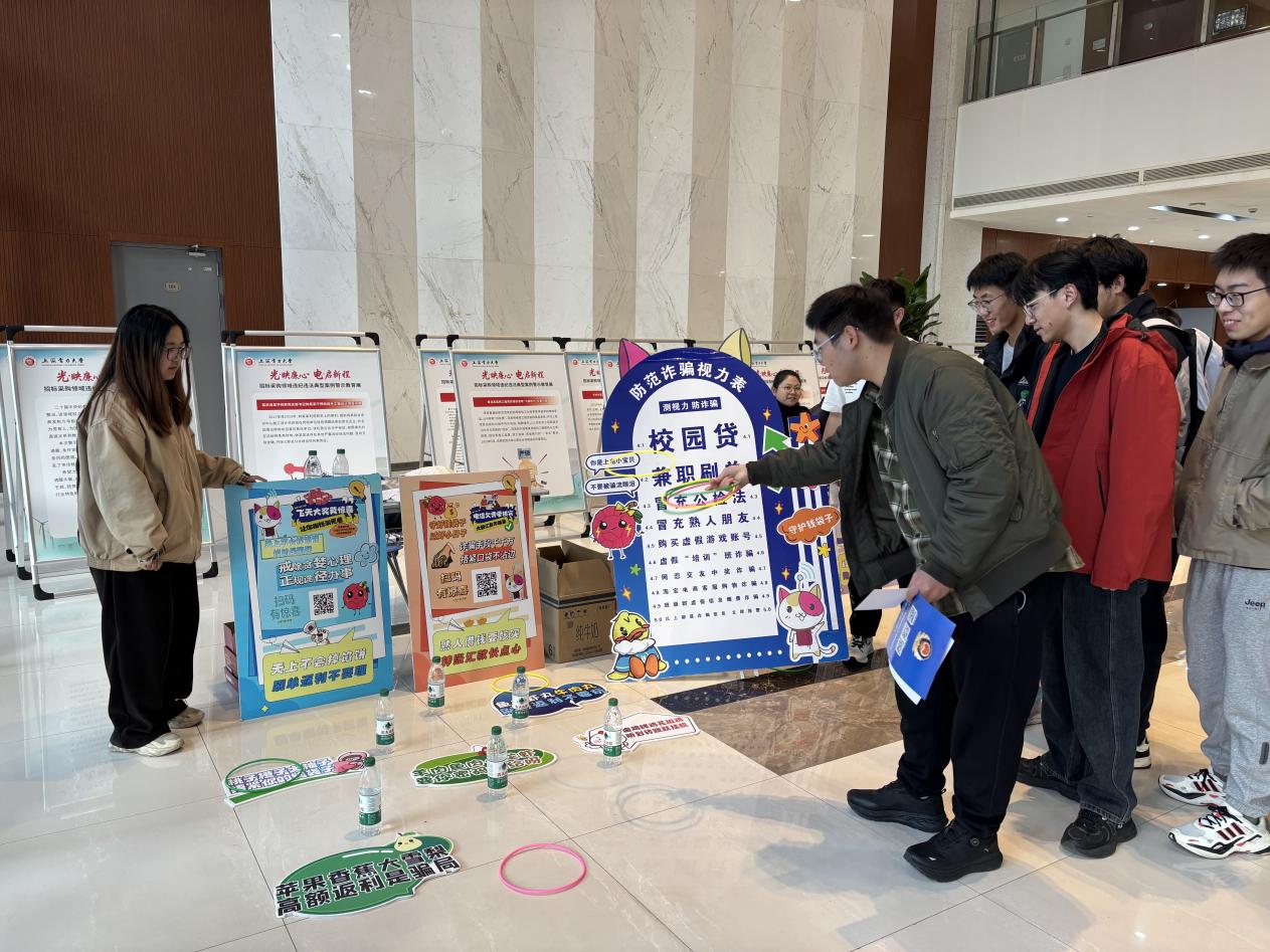 反诈互动区设置五大创意关卡,打破传统宣传枯燥感。“反诈知识套圈圈”中,参与者套取贴有反诈问题的道具并作答,在互动中强化防骗记忆;“反诈飞行棋”环节,师生化身“反诈小先锋”,在掷骰前行中识别“刷单返利”“冒充客服”等骗局场景;“反诈问题大考验”以转盘随机模式引发参与热情,以答题与获奖双重体验加深知识记忆;“词中有诈·拆穿骗局”通过图片表情猜反诈词汇,在脑力比拼中提升识骗敏感度;“防骗口号‘配对’乐”要求配对反诈关键词,在记忆考验中强化反诈关键词认知。
