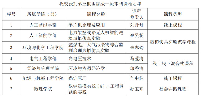 刘丹丹副教授负责的《单片机原理及应用》课程认定国家级一流课程,这是我校首门国家级线上一流课程。《数学建模实践(4):工程问题的实践》是孙玉芹教授负责的国家级一流社会实践类课程,也是我校首次获得该类型的国家级一流课程。《锅炉原理》《高电压技术》《环境与资源经济学》《电力架空线路无人机智能巡检虚拟仿真实验》《燃煤电厂大气污染物综合监测治理虚拟仿真实验》等5门新认定的国家级一流本科课程均体现了学校鲜明的能源电力特色。