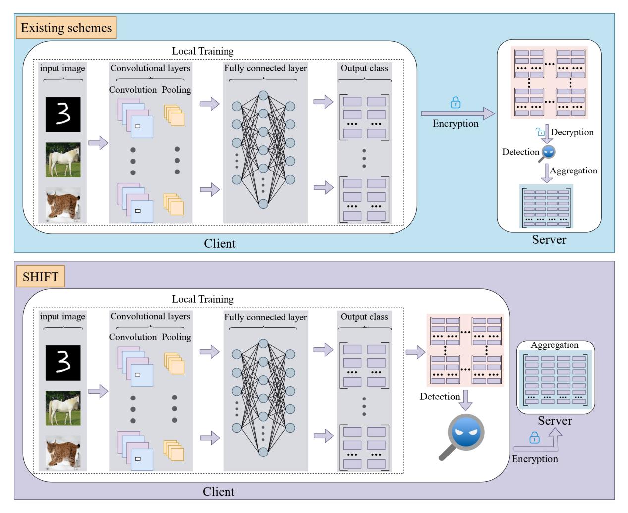 联邦学习的分布式架构容易遭受隐蔽的后门攻击:攻击者可在本地训练中植入触发器,使全局模型在特定输入下产生恶意行为,从而威胁系统的可靠性。现有不少防御方法需要在服务器端对加密上传的梯度先进行解密然后再进行检测,往往带来显著计算开销与部署负担。