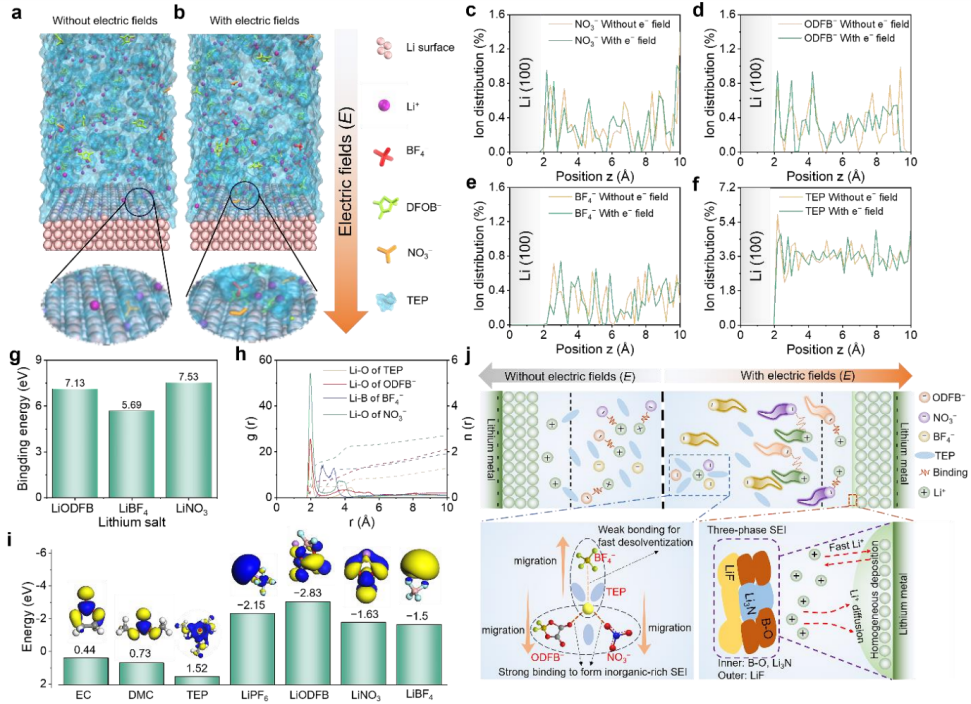 面对这一挑战,我校研究团队设计了一种以磷酸三乙酯(TEP)为单一溶剂的本征不可燃电解液体系,并引入多种锂盐进行精准调控。研究的亮点在于“电场调控阴离子运动方向”这一核心机制。团队敏锐地捕捉到不同阴离子与锂离子结合能的差异,利用外加电场的导向作用,指挥阴离子在电极表面“各就各位”,从而构筑出具有明确功能分区的“三相”固态电解质界面(SEI):内层“守门员”(富含Li3N)——由强结合力的ODFB-和NO3-阴离子在电场驱动下优先分解形成,不仅提供了极高的离子电导率,更显著降低了界面阻抗,确保离子快速、均匀通过;中层“缓冲垫”(B-O玻璃态)——作为低结晶度的过渡层,它赋予了SEI膜优异的机械柔韧性和形变自修复能力,有效抑制了锂枝晶的刺穿;外层“装甲层”(富含LiF)——由弱结合力的BF4-阴离子在外层形成,提供了极高的硬度和化学稳定性,像一层坚不可摧的铠甲,抵御高电压正极的氧化侵蚀。这种“内柔外刚、导离子与阻电子”协同作用的智能界面,完美解决了传统SEI膜“一损俱损”的结构缺陷。