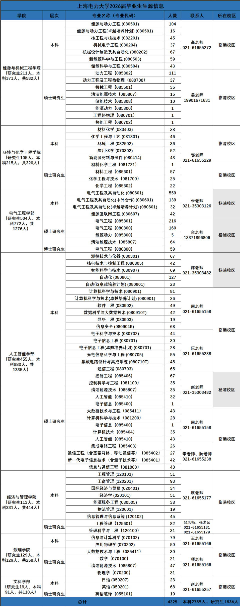 上海电力大学2026届预计毕业生4325人,其中本科毕业生2789人,研究生毕业生1536人,各专业预计毕业生人数、联系方式等信息请见下方表格:
