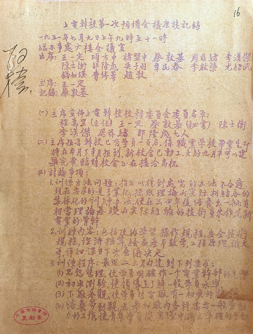 短短三日后,即7月9日,上海电力公司召开上海电业学校第一次筹备会议,成立校务委员会(见图2),由程万里、王一定、蔡敦基、陈士衡、李汉杰、周兹绪、邵隆彪七位同志组成,程万里担任主任委员。会议明确学校培养目标为:三年内,通过理论与实践相结合、技术与政治相结合的教育模式,让高中毕业生掌握火力发电厂相关技术理论知识,具备相当于大学毕业的理论水平,在实际技能方面能够胜任火力发电厂相关部门的技术管理工作。 8月18日,“上海电业学校”校名正式确立(见图3)。