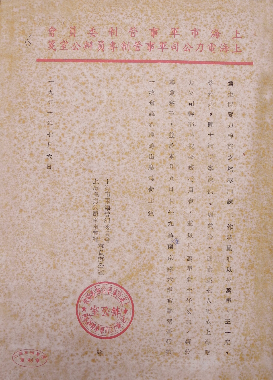 同年7月6日,军事管制委员会下发的一纸文件(见图1),悄然揭开了这所电力学府的序章。