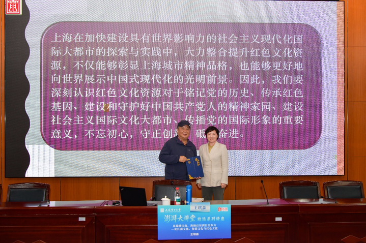 讲座结束后,党委副书记、纪委书记张艳林代表学校向王琪森赠送感谢状。本次讲座不仅是一次文化的解读,更是一次对上海城市的精神品格、文化基因的深刻诠释,激励着在场师生不忘初心,砥砺前行,为建设社会主义国际文化大都市贡献力量。