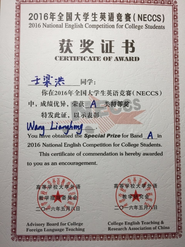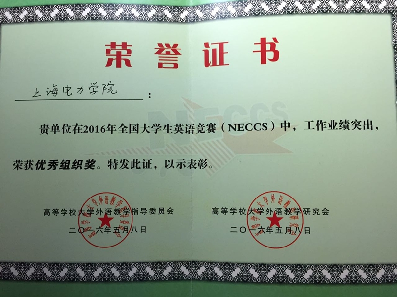 近日,外国语学院组织我校四名同学赴上海交通大学参加了2016年全国大学生英语竞赛上海赛区复赛,经过激烈的比拼,最终王梁洪同学获得上海赛区研究生A组特等奖的好成绩;张楠、方煜盛与王琳媛三名同学分别获得A、B、C组的一等奖,我校荣获大赛“优秀组织奖”。
