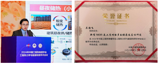 我校能源与机械工程学院潘卫国教授受邀作可再生能源、脱碳与储能分会场主席,刘方教授、王渡副教授、张涛副教授、吴韶飞老师等参加本次会议。在优秀论文评选环节,吴韶飞老师所作的题为《新型MOF-氨工质对的多效储存适应性研究》论文报告最终获得大会优秀论文奖,研究生刘欣、狐豆豆分别作口头报告和展报交流。