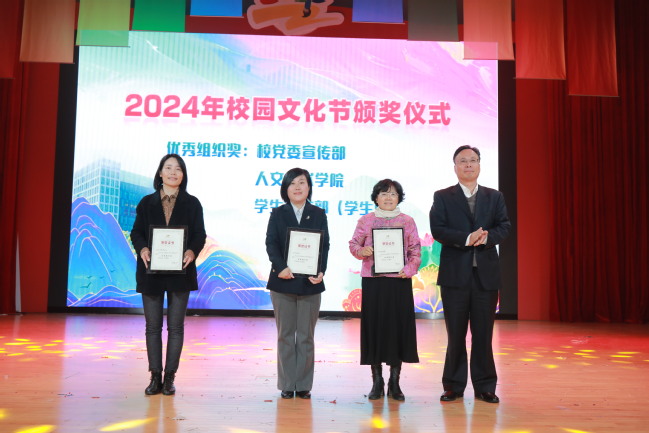 在2024年校园文化节优秀活动颁奖上,顾春华为2024年校园文化节“优秀组织奖”获奖单位颁奖。
