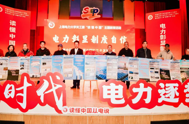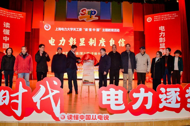 在全场热烈的掌声中,金勤明、朱克勇为手账卡揭幕,上海电力大学“读懂中国从电说·电力彰显制度自信”手账卡(第六辑)正式发布。