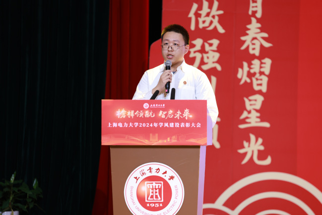 会上,2023-2024学年优良学风示范班代表和2024年上海电力大学大学生年度人物代表分别作经验分享。电气工程学院202202J1班学生代表钱易申以“春种·夏忙·秋收·冬藏”为主线,详细介绍了班级学风促进机制、学风建设实践和成效等;计算机科学与技术学院学生陈婉晏作为2024年大学生年度人物代表,围绕“创新赋能、多维发展”讲述了自己在学校的成长与收获,表达了对学校和老师培养的感恩之情。