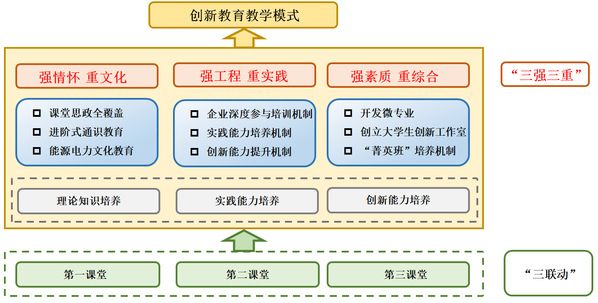 聚焦第一课堂育人主渠道、打造素质教育第二课堂、构筑企业第三课堂,通过“三联动”实现“三强三重”。“三强三重”即“强情怀、重文化”,实施课程思政与进阶式通识课程改革,增强学生的行业情怀和文化素养;“强工程、重实践”,建立发电企业深度参与实践教学机制,以科创、实践课程和实习实践为抓手,强化学生工程实践能力培养,实施人才培养大学毕业证和职业资格证的“双证融通”;“强素质、重综合”,推行线上微专业、开设交叉融合课程、试点电力菁英计划等,培养学生的综合素养。