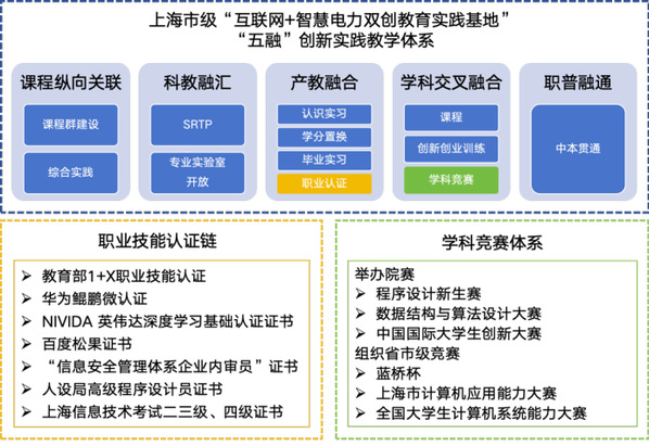 立足上海市级“互联网+智慧电力双创教育实践基地”,构建以平台建设为基础的“五融”实践教学模式,即通过课程纵向关联(课程群)、科教融汇(SRTP)、产教融合、学科交叉、职普融通,实施“全过程”实践教学。建立学院科创中心,整合各类创新创业教育资源,将创新创业活动有机融入学生大学四年的学习生活中,打造“学-践-赛-创”的全链条科创教学体系。通过举办程序设计新生赛、“计科杯”数据结构与算法设计大赛等构建院级学科竞赛体系,培育高水平学生科创团队;构建由教育部“1+X”大数据平台管理与开发职业技能认证、上海市高等学校信息技术考试、浦东新区人社局职业技能证书、百度松果学堂、华为人才发展加速计划、英伟达“校园大使计划”等组成的产业认证链,提升学生创新实践能力。近年来,已有百余人通过鲲鹏微认证,300余名本科毕业生通过相关职业技能认证考试,有效地提升学院应用型人才培养质量。