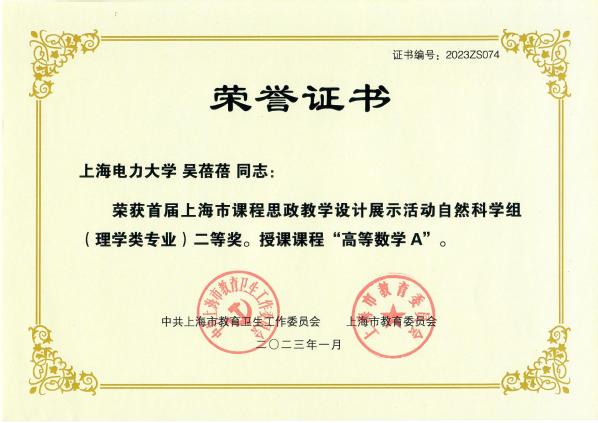 “大学数学课程培养学生解决复杂工程问题能力的教学改革与实践”以唯一完成单位获得了上海市教学成果奖一等奖。
